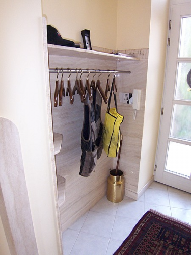 A Feladat: Egy régi ügyfelünk, akinek a házában sok munkát végeztünk, kérte, hogy az előszoba falát burkoljuk be kővel, hisz a fal rövid használat során elkoszolódott a vizes kabátok, esernyők stb miatt. Az előszoba ezen részét, szerette volna polcokkal is feldobni, valamint a praktikusság is megkívánta. Sarokpolc, valamint az akasztó fölé egy kalap-, táskatartó polc is a megrendelő igénye volt.