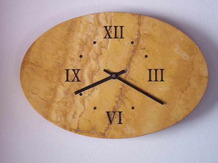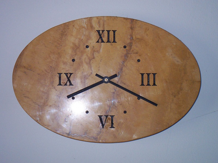 A megoldás: A választás azért esett a sárga kőre, hogy a napot jelképezze.A műhelyben a követ megfelelő méretűre vágtam, majd csiszoltam. Ezt követően elvittem homokfújásra, ahol a számok felkerültek a kőre. Az óra szerkezetet egy órás mester készítette.