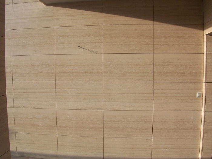 A megoldás: A mészkövet egy importáló kollegánk szállította be. A tervek és a táblák mérete a gazdaságosság és a kiosztás szempontjából nem a legmegfelelőbbek voltak. Némi módosítás után, a megrendelő teljes bizalmával, a vágás folyamata elindult. Itt a legnehezebb lépés volt, hogy a kövekben lévő szálirány megfelelően fusson a falra helyezéskor. A mészkőlapok kapcsolással és ragasztással kerültek a falra.