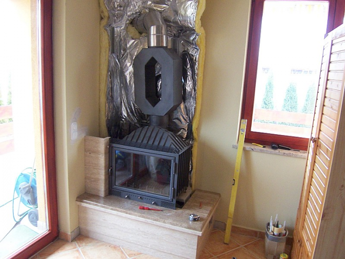 A kandalló megfelelő hőleadása érdekében egy hődobot is beépítettünk, amely fokozza a tűztér teljesítményét. Sikerült egy ár-érték arányban megfelelő minőségű és áru tűzteret találnunk, ami 100 ezer forintba került. (Pusztán csak a miheztartás végett: kapható tűztér akár kétmillió forintért is, igaz, ez már valóságos műremek: liftes ajtó, a csakis a japánok által gyártott íves, hőálló üveg, beépített ventilátor és így tovább…) A kis hely miatt különös gondot fordítottunk a hőszigetelésre: a tűztér alá, mellé egy különleges, csillámos hőszigetelő anyag került.