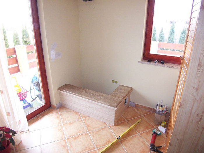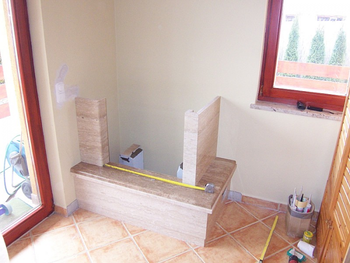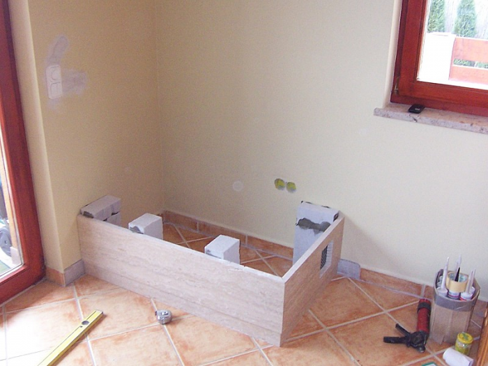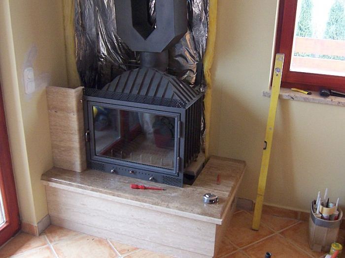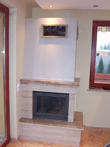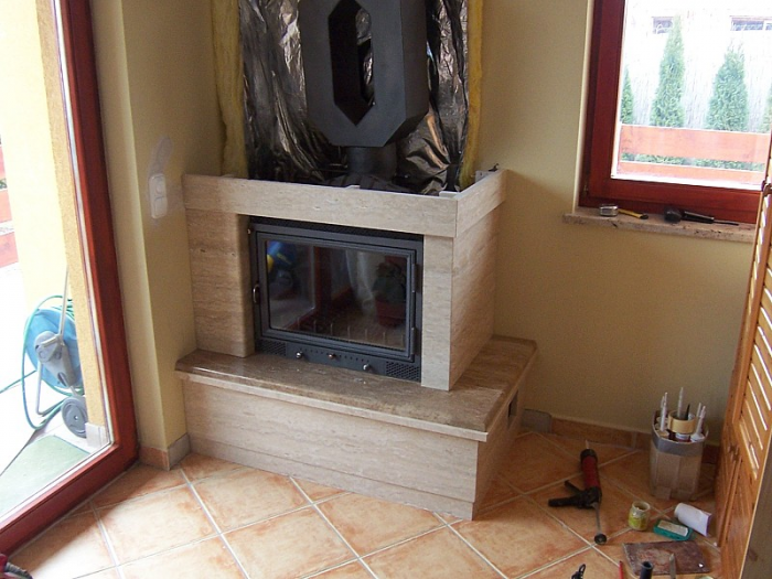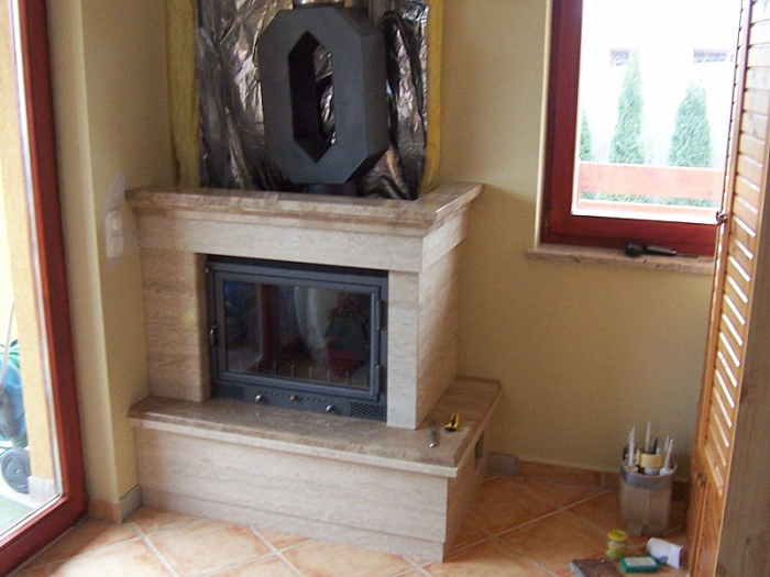 A MEGOLDÁS: Miután a megrendelőnek nem volt határozott elképzelése az építendő kandalló anyagáról sem, igyekeztünk olyan kőmintákat mutatni, amelyek illenek a környezetbe. Különféle színű és keménységű gránitot és mészkövet mutattunk, végül egy török mészkövet, a Travertin bézs árnyalatát választottuk. A tűztér alá pedig Ytong tégla került.