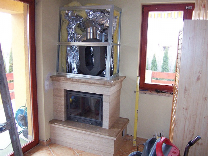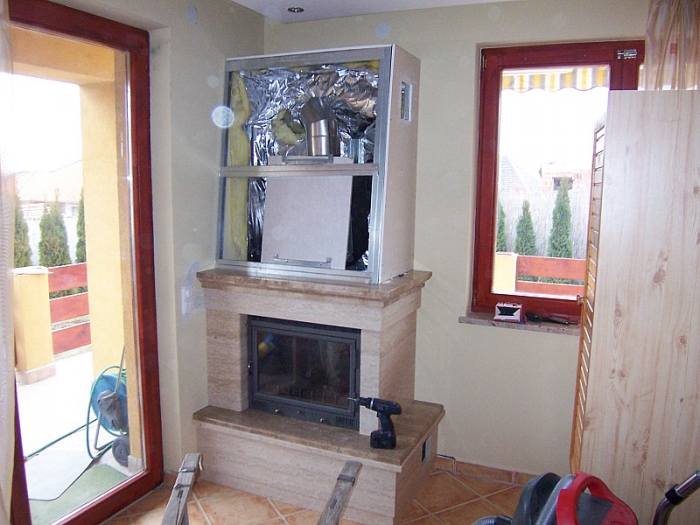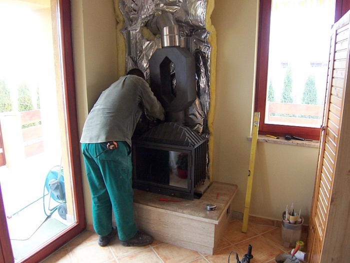 Az szükséges kémény a ház falán kívülre helyezték, a munkát egy szakértő alvállalkozóval készíttettük el.