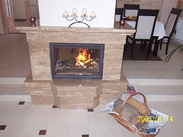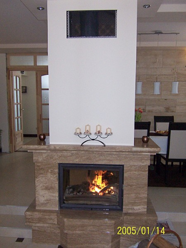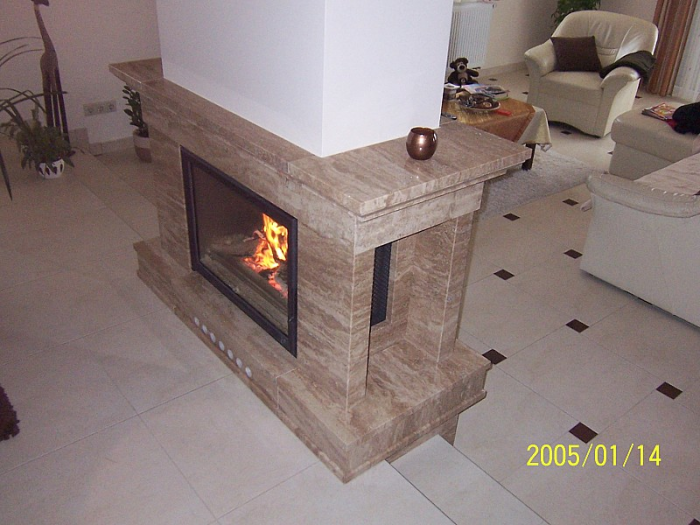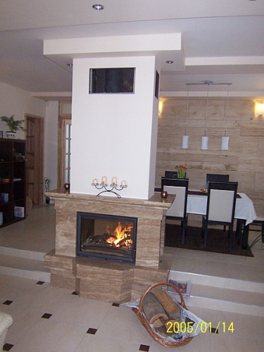 A megoldás: A kandalló a nappali és az étkező közé lett felépítve. A helytakarékosság végett könnyű, szerelt kéményt alkalmaztunk, mely nem igényli, hogy az aljzatra támaszkodjon, így helyet spóroltunk. Olyan, úgynevezett „kétarcú” tűztér lett beépítve, amelyben ha ég a tűz, azt a nappaliból és az étkezőből is tökéletesen látni. A jobb hatásfok érdekében a tűzteret egy lemezburkolattal vettük körbe, melyhez légelvezető csöveket csatlakoztattunk, alulra egy ventillátort szereltünk. Ezzel a hő elvezető rendszerrel a kandalló egyszerre fűti a nappalit a fürdőt és két hálószobát. Hatásfoka olyan jó lett, hogy 0 és -5 fok közötti külső hőmérséklet esetén is 21- 22 fok között tudja tartani az épület hőmérsékletét. Az egyszerű, de tetszetős vonalvezetésű kandallót a Travertino Noce mészkő teszi különlegessé.